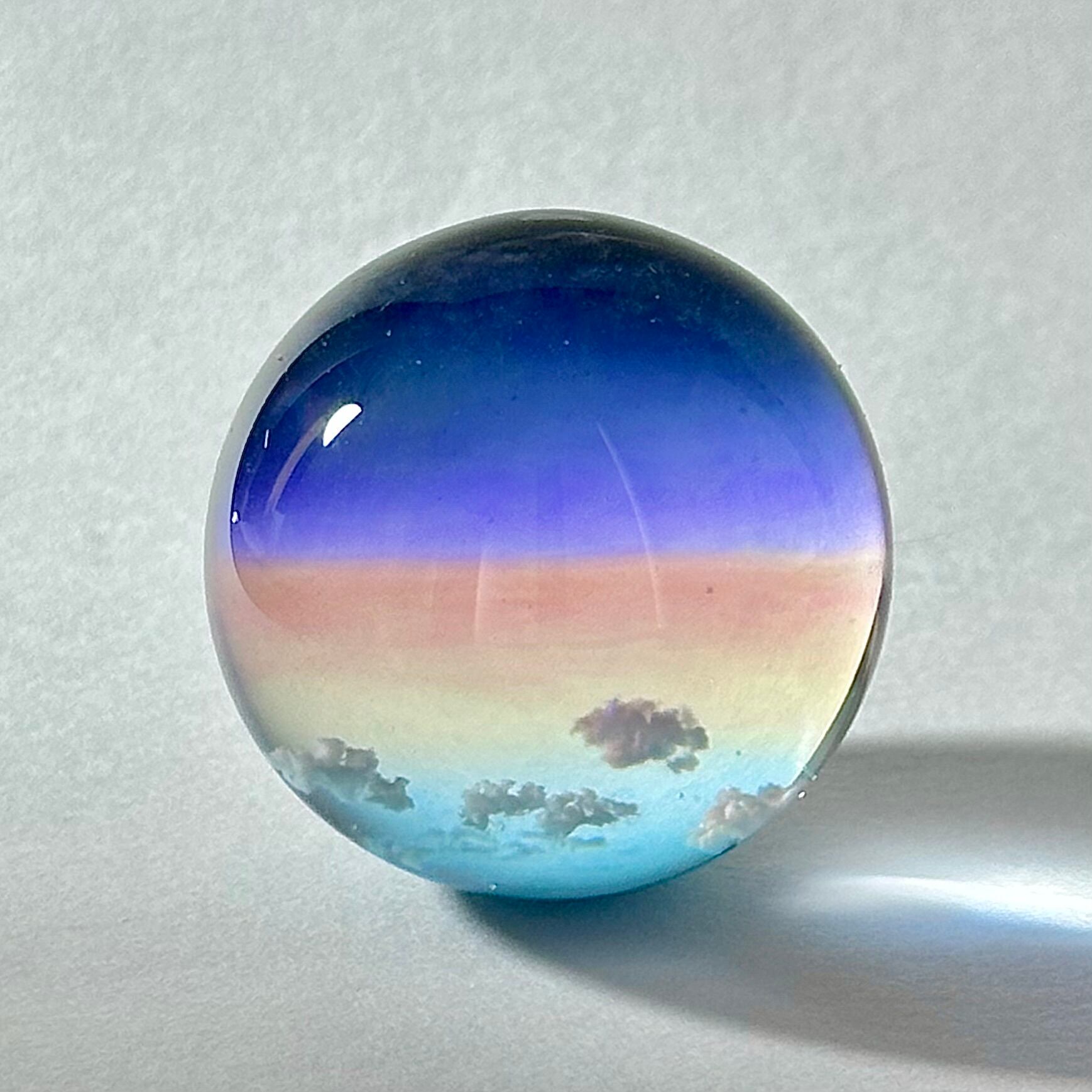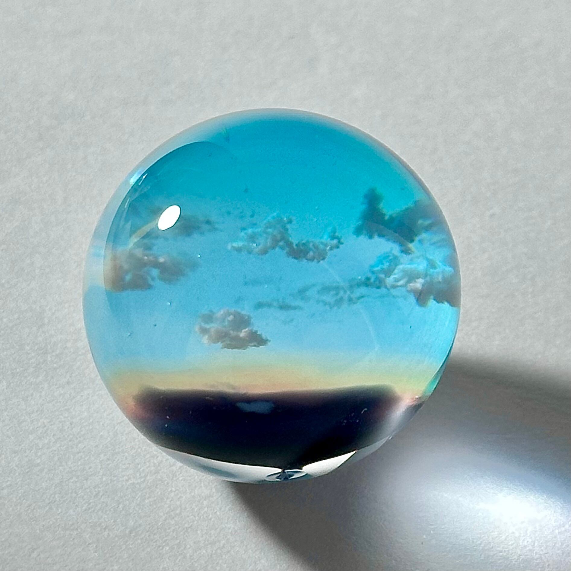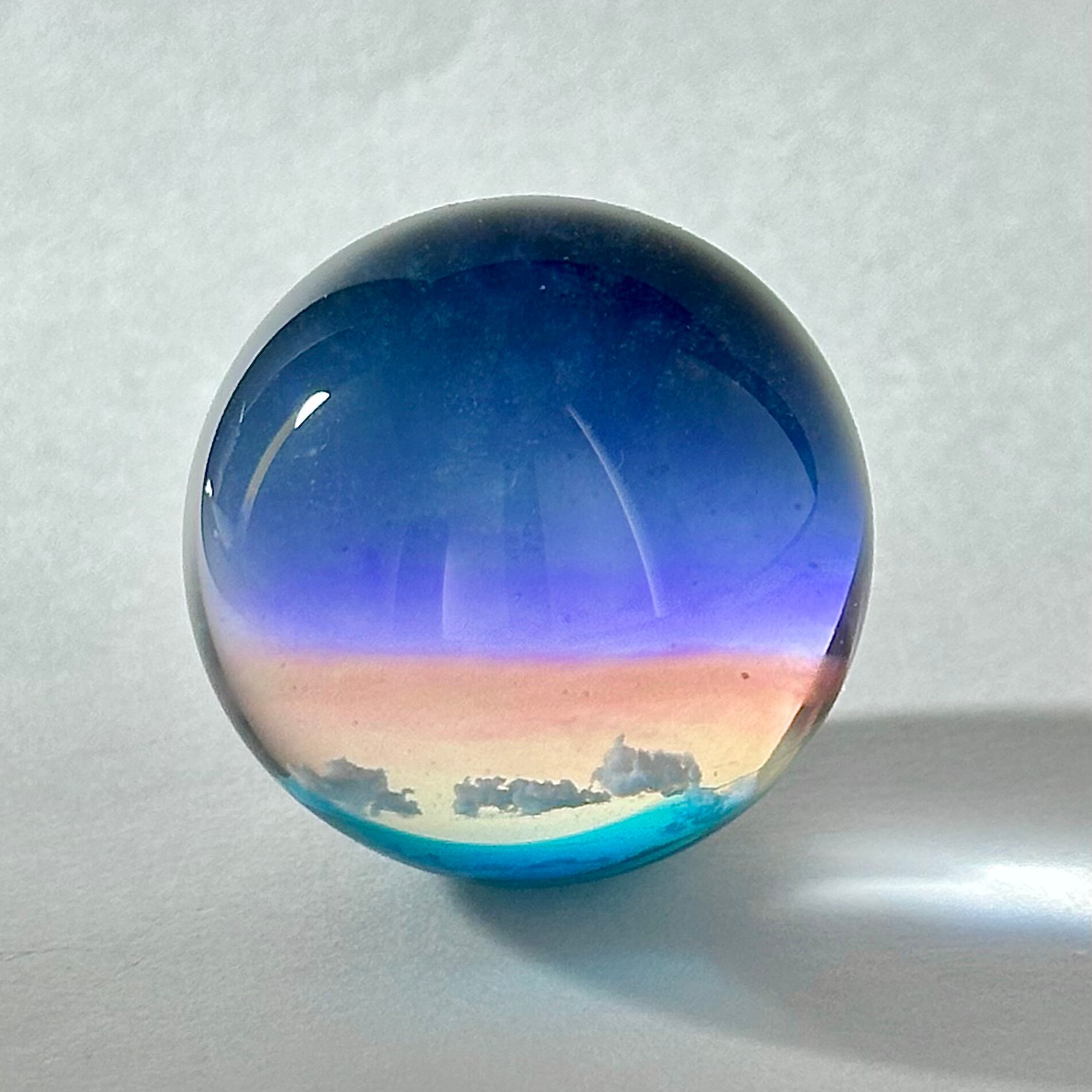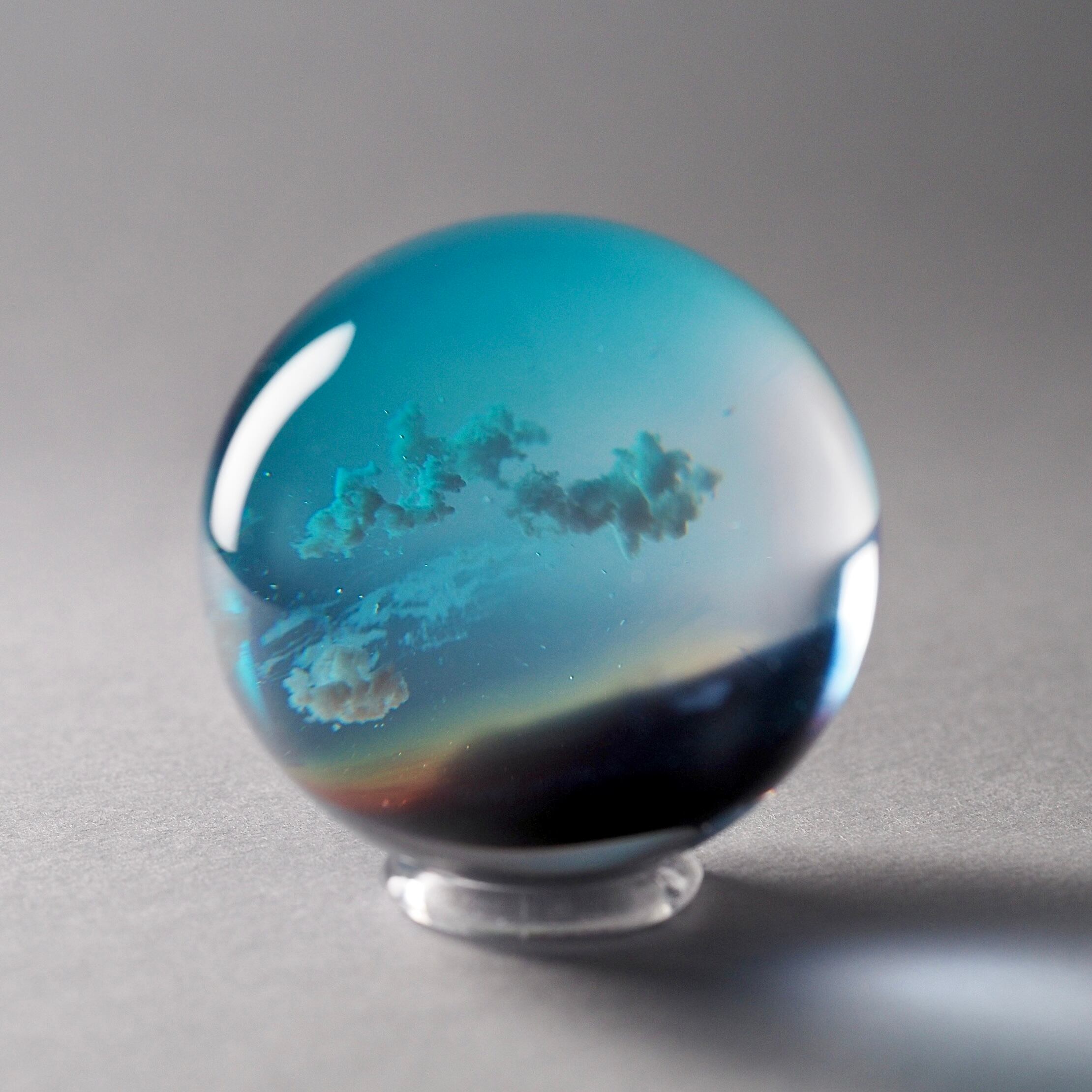 一つの球体に、二つの異なる空を閉じ込めた幻想的な作品です。