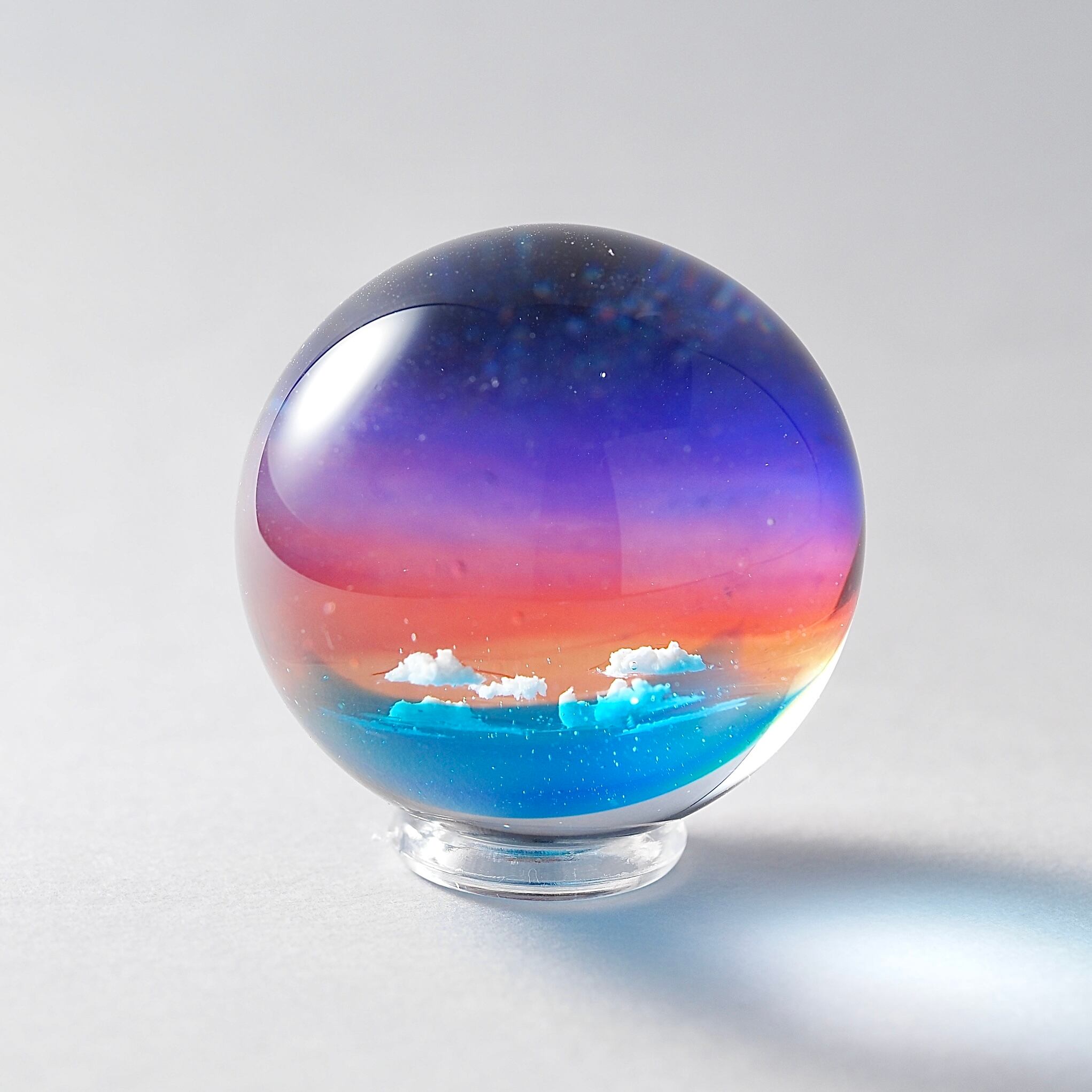 一つの球体に、二つの異なる空を閉じ込めた幻想的な作品です。