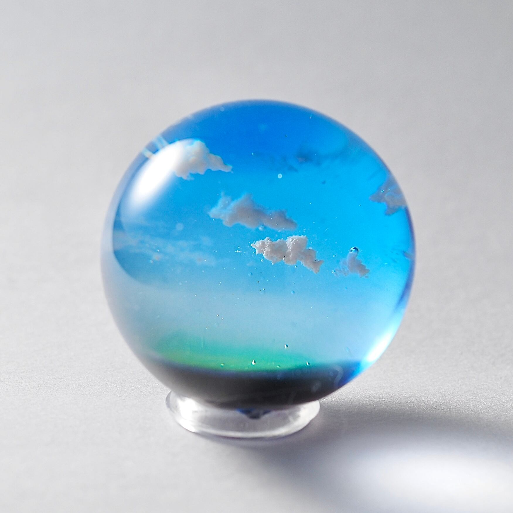 一つの球体に、二つの異なる空を閉じ込めた幻想的な作品です。
