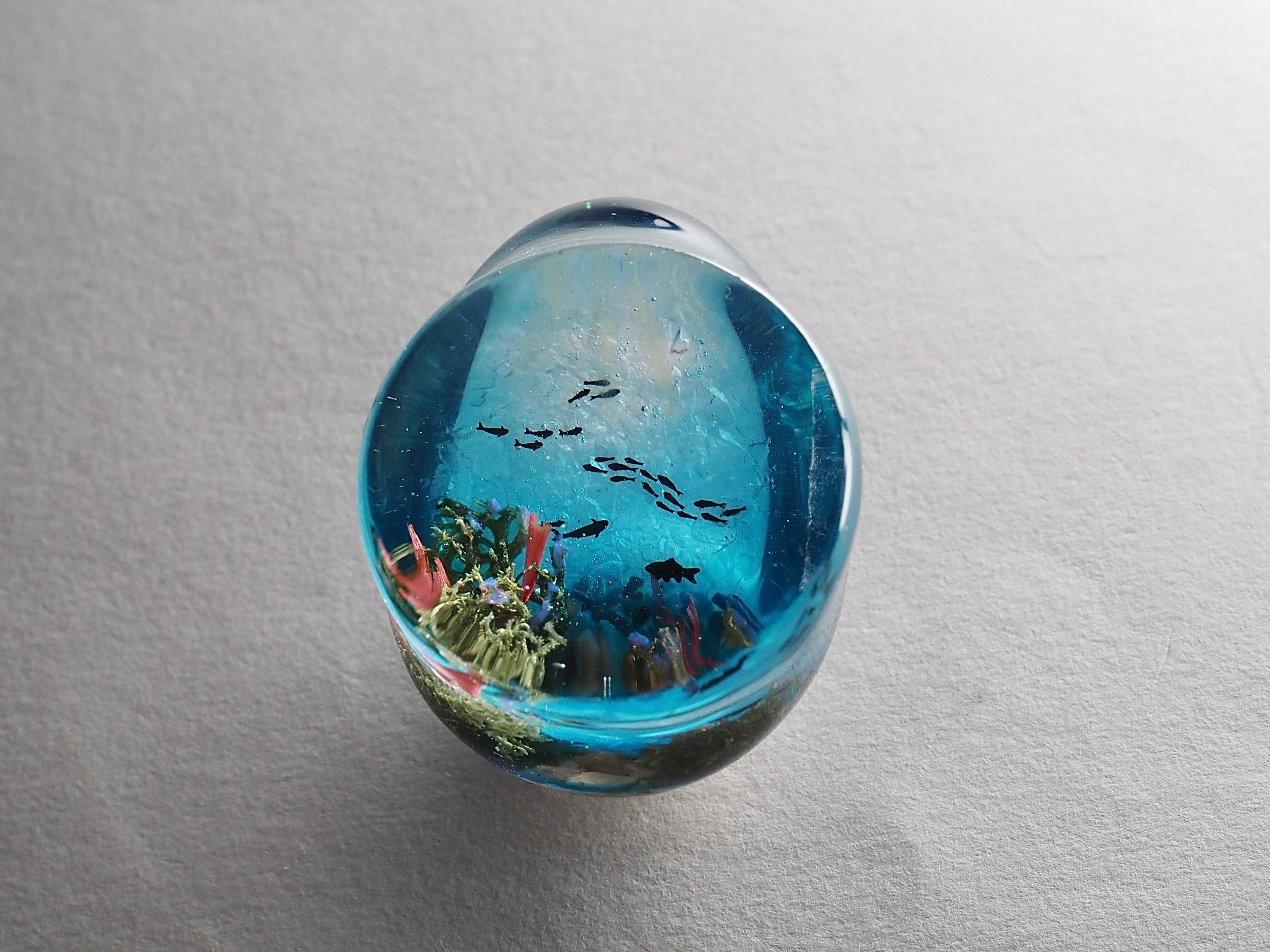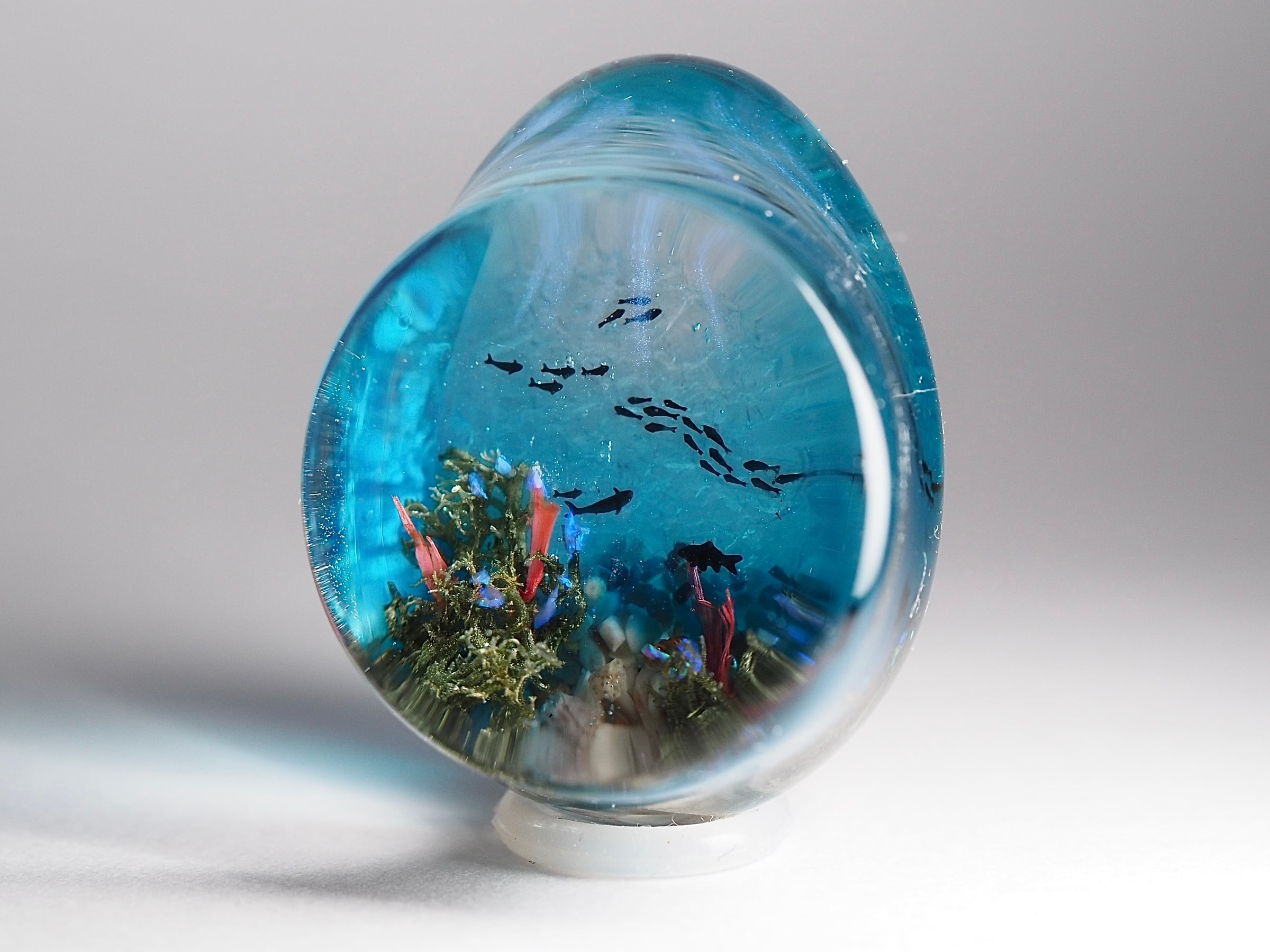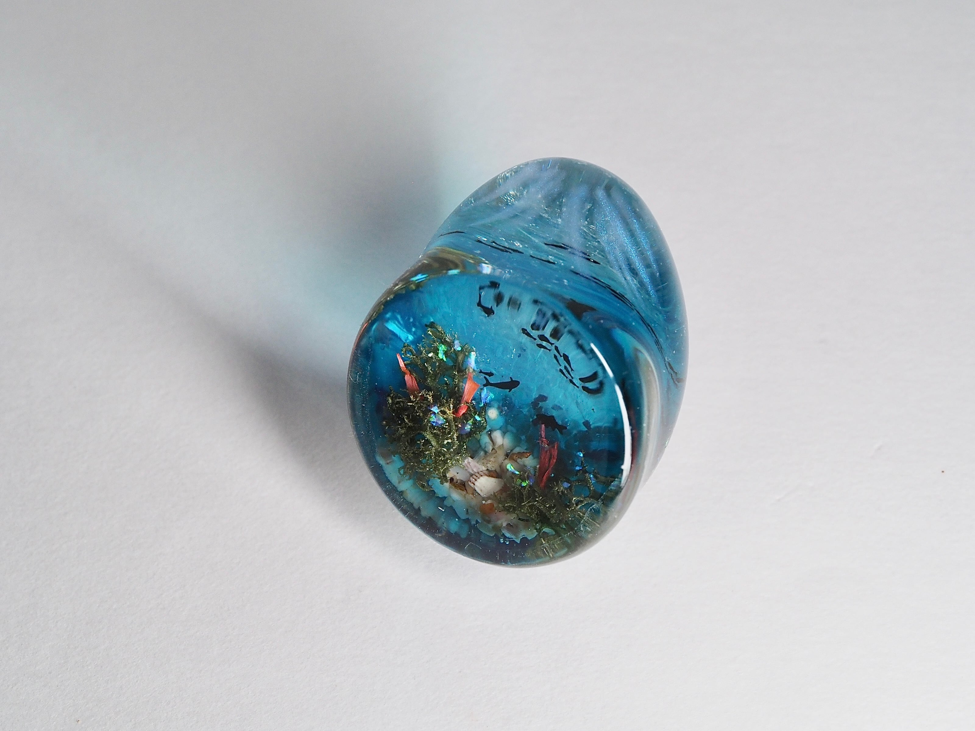 青の透明に包まれた、たまごの中に、静かな海の世界を閉じ込めました。