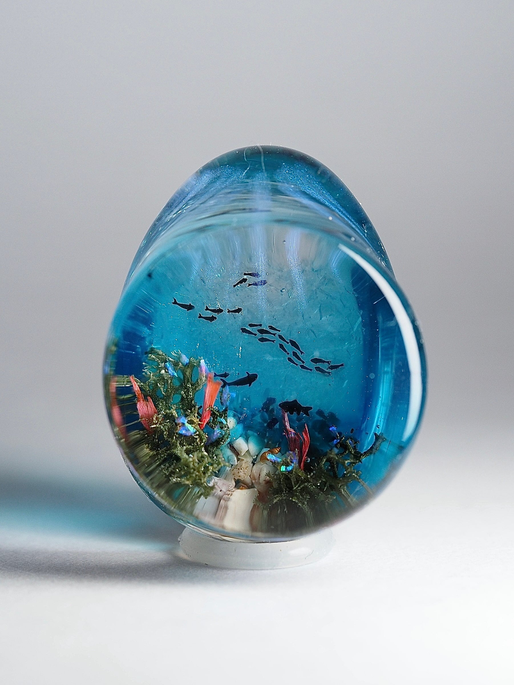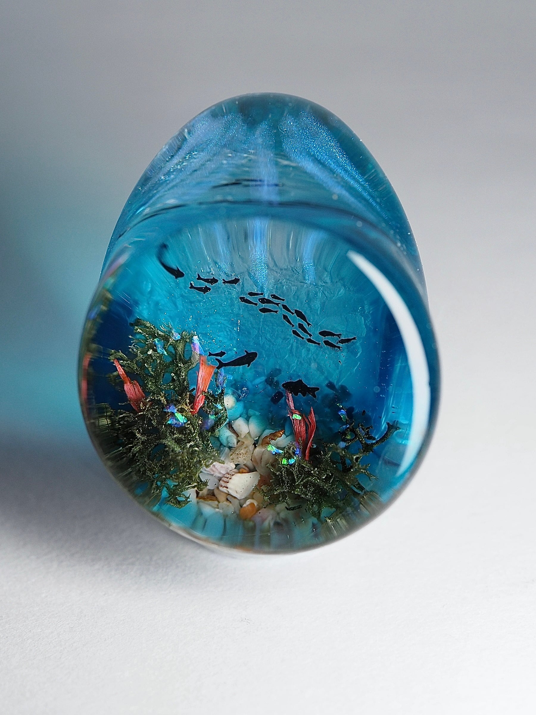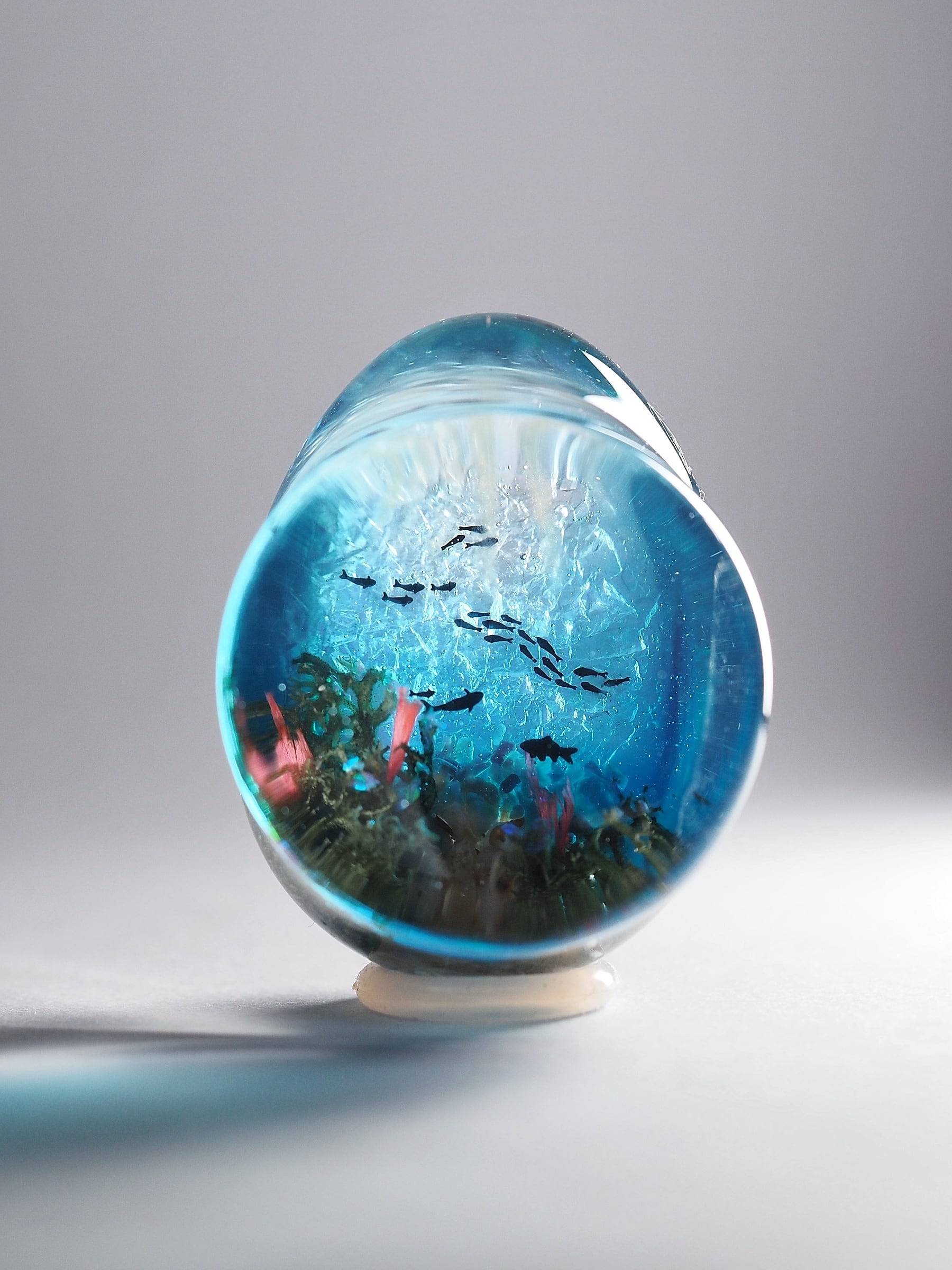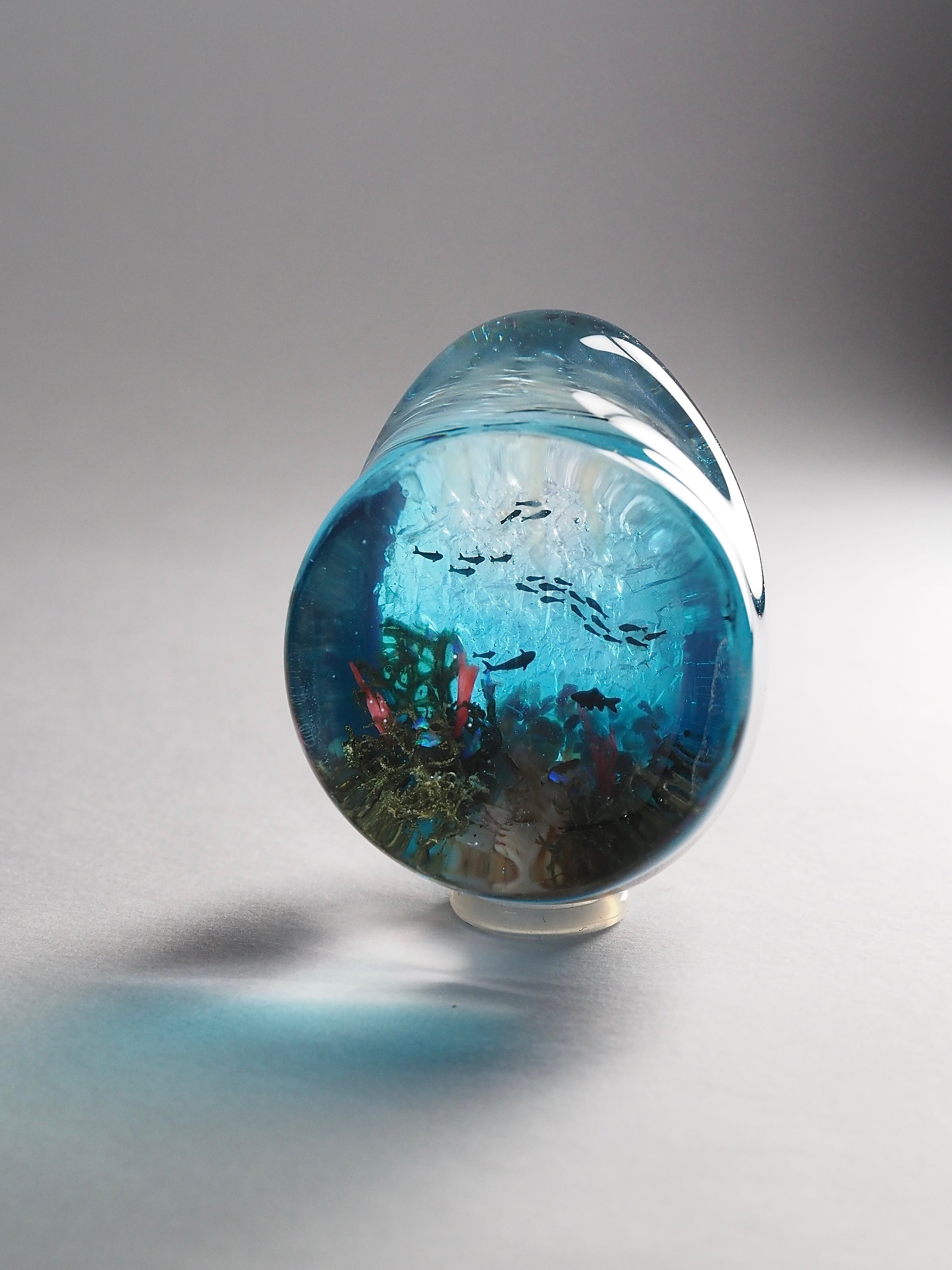 青の透明に包まれた、たまごの中に、静かな海の世界を閉じ込めました。