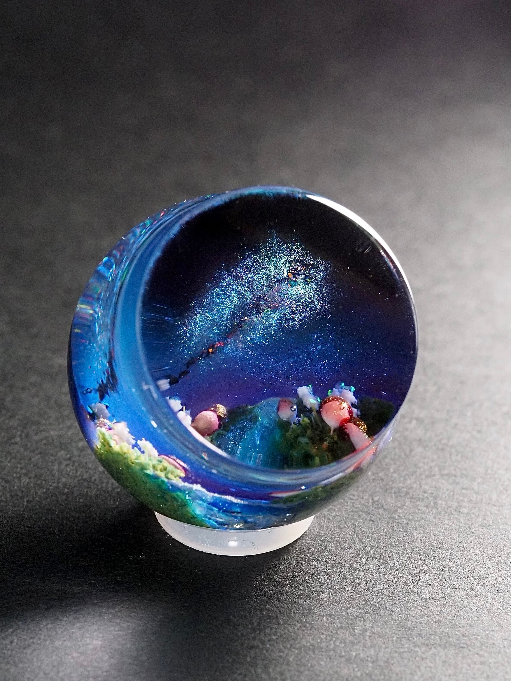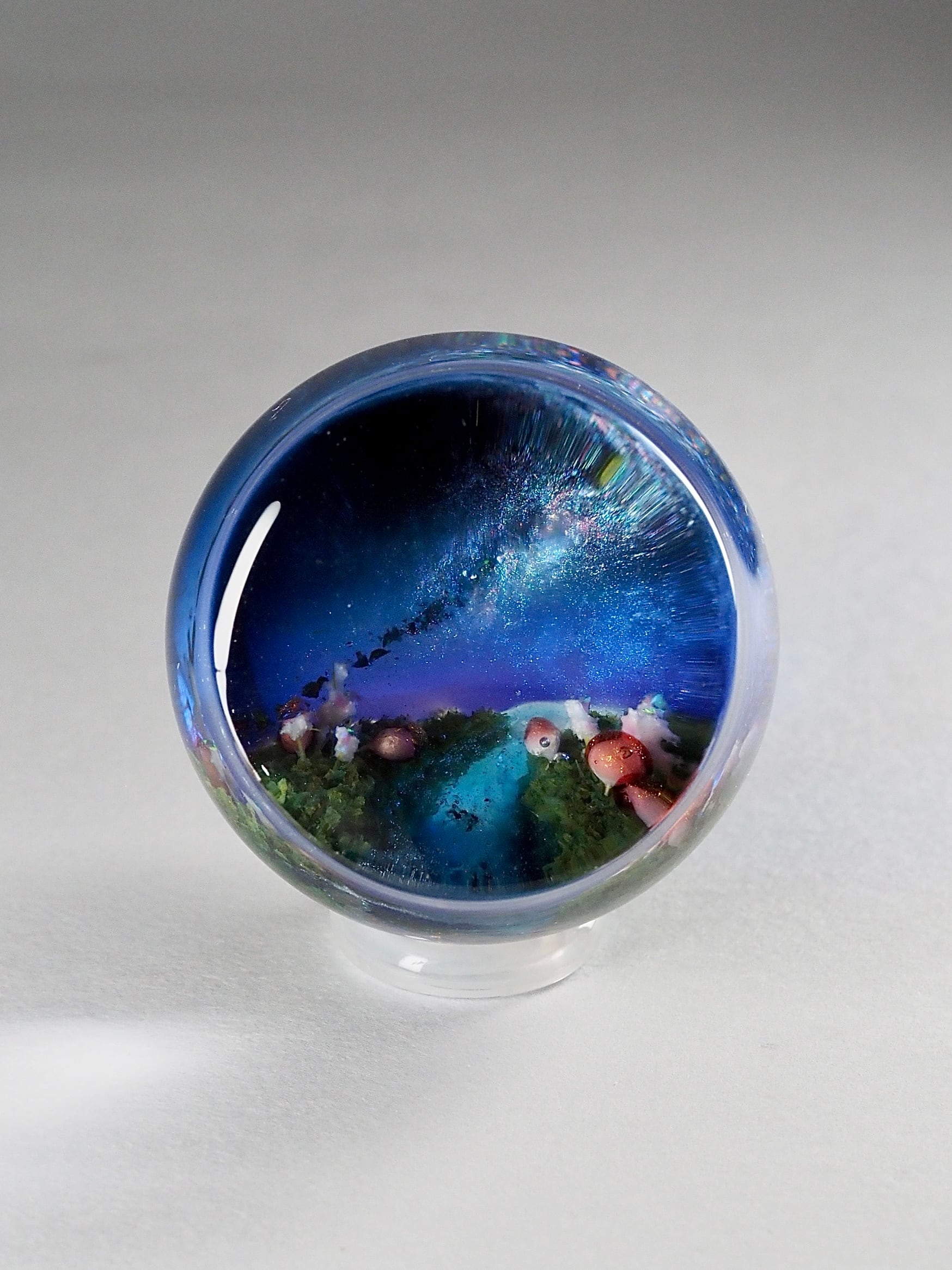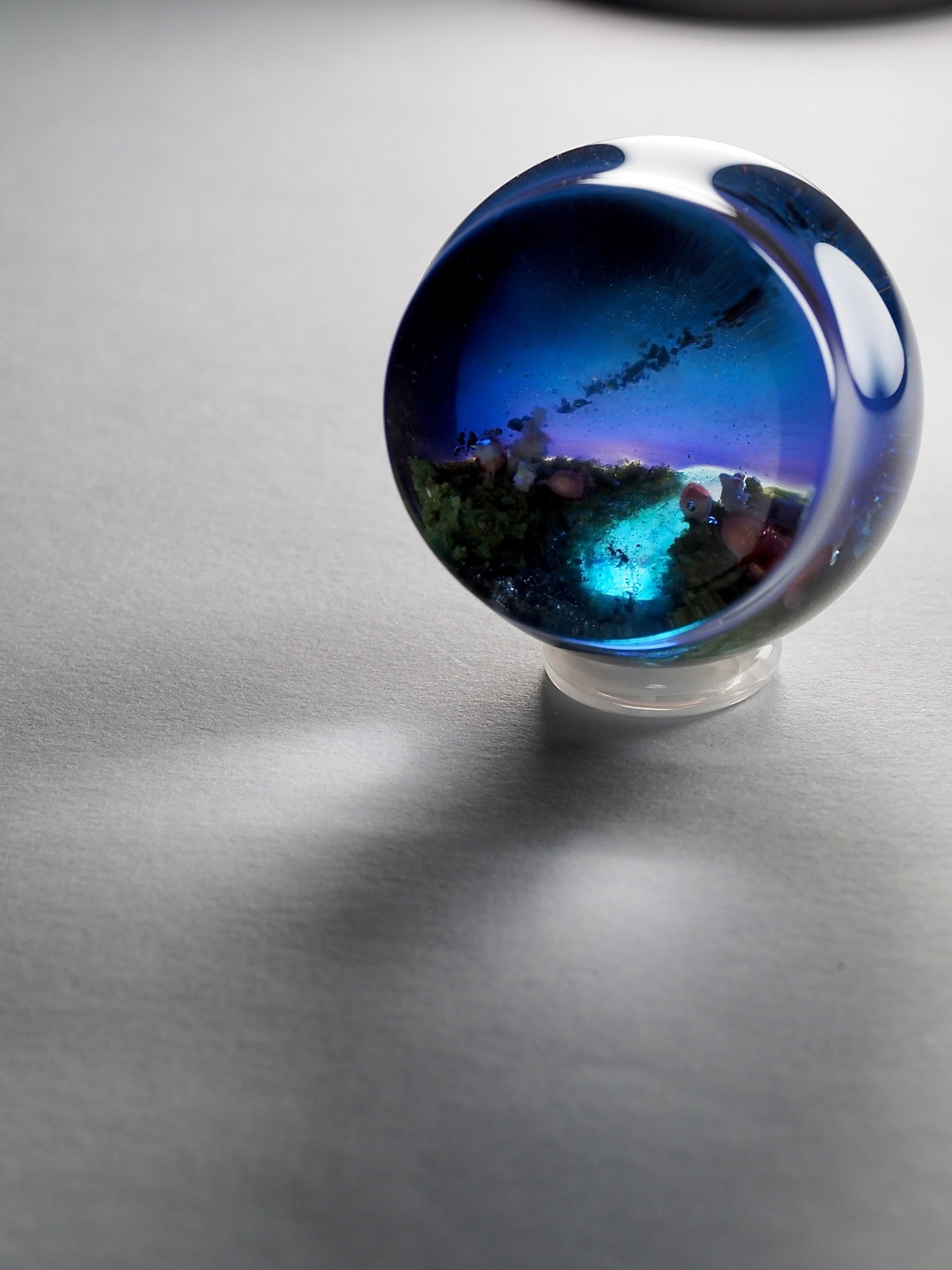 直径3センチの透明な球の中に、夜空を渡る星の川と、ひっそりとした丘の景色を閉じ込めました。
